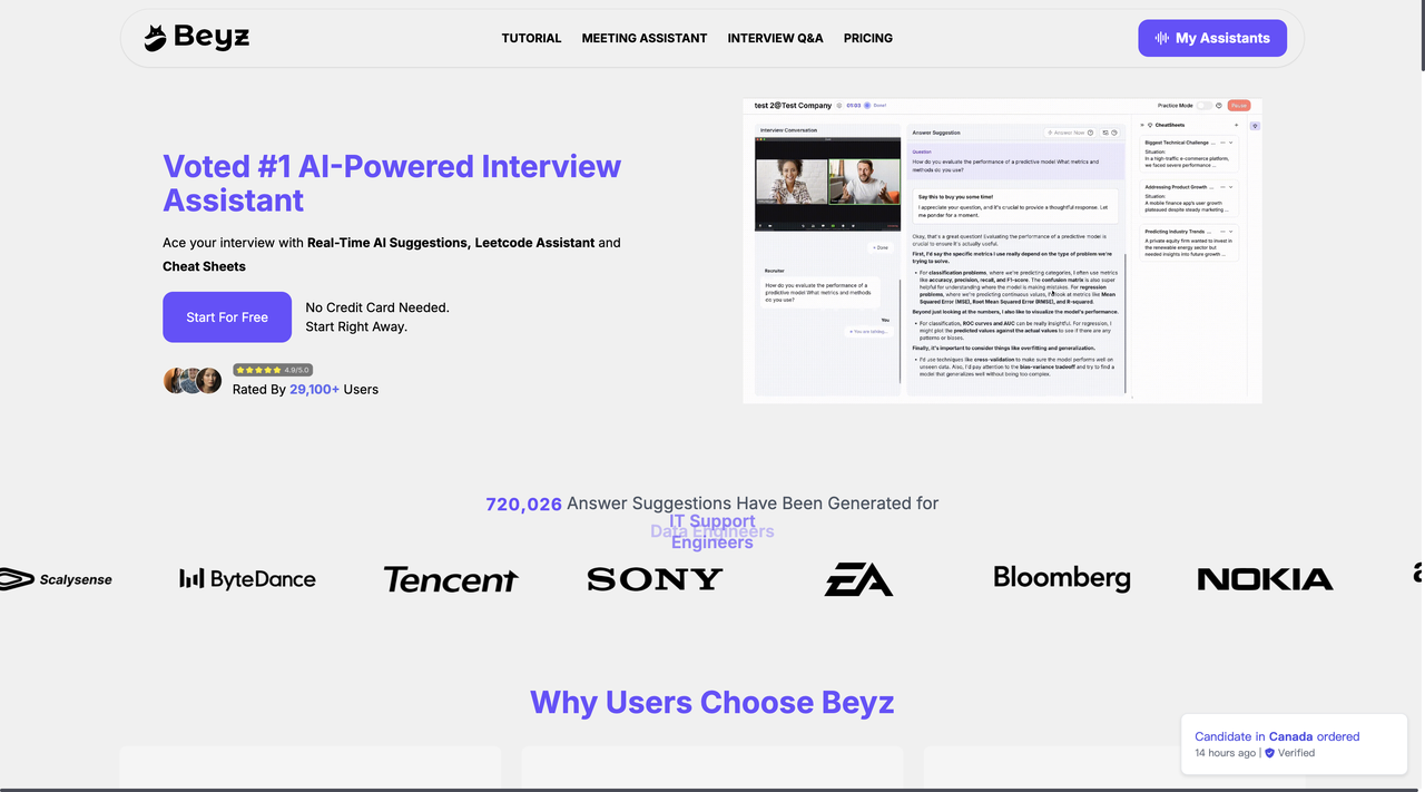- Pros: Best for real-time answers during live interviews—a true AI interview copilot with Real-Time AI Suggestions plus AI-powered coding assistant support.
