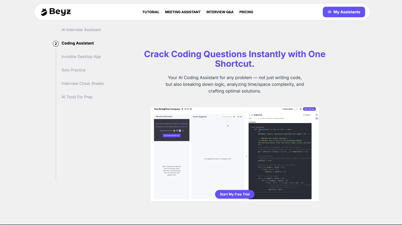 Beyz Interview Helper: Acts like an AI Interview Copilot for Technical Interviews—its AI coding assistant emphasizes logic breakdown, edge cases, and time/space complexity cues, helping you narrate cleanly under time pressure.