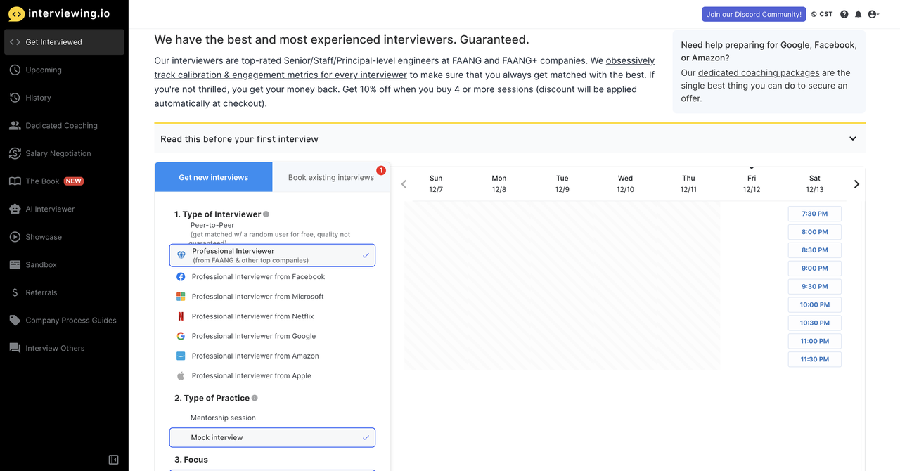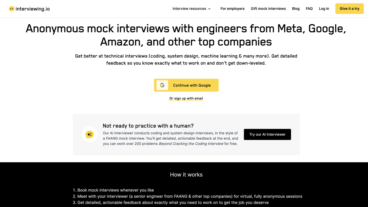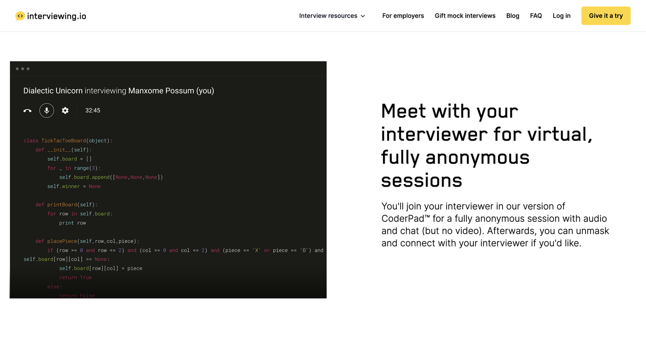 interviewing.io is an anonymous mock interview platform: you practice with senior engineers in an audio + chat environment (no video) and receive detailed feedback after.