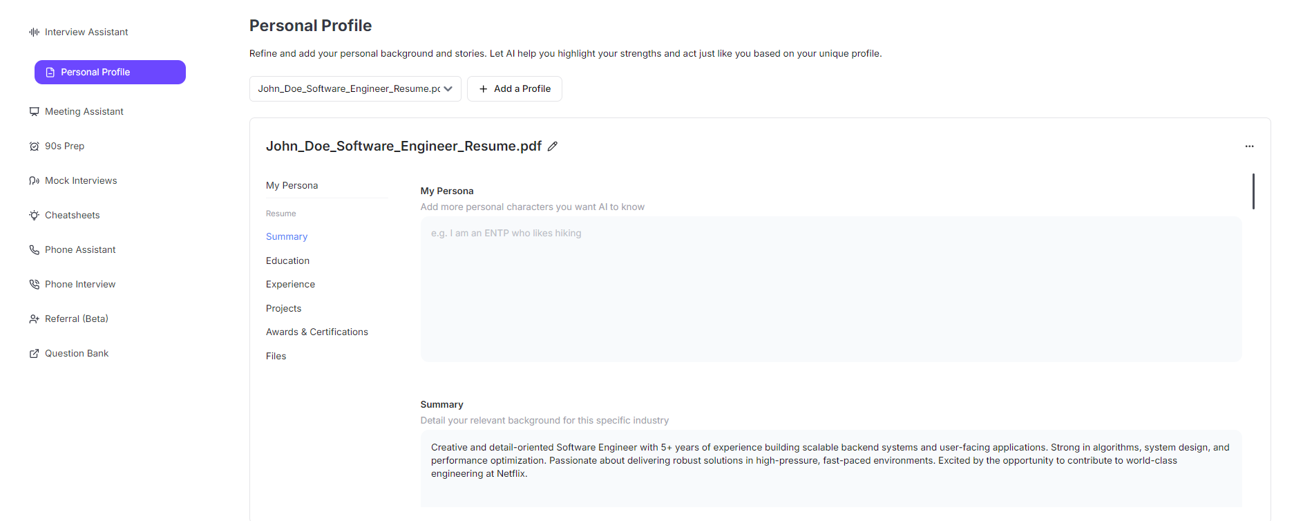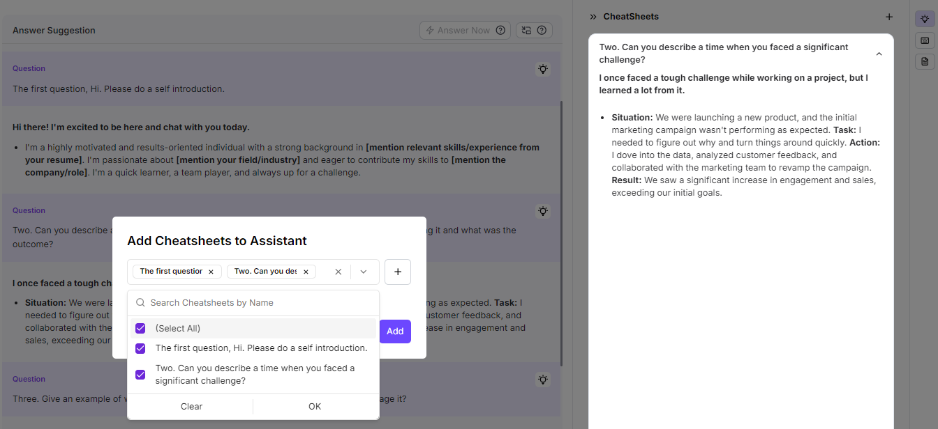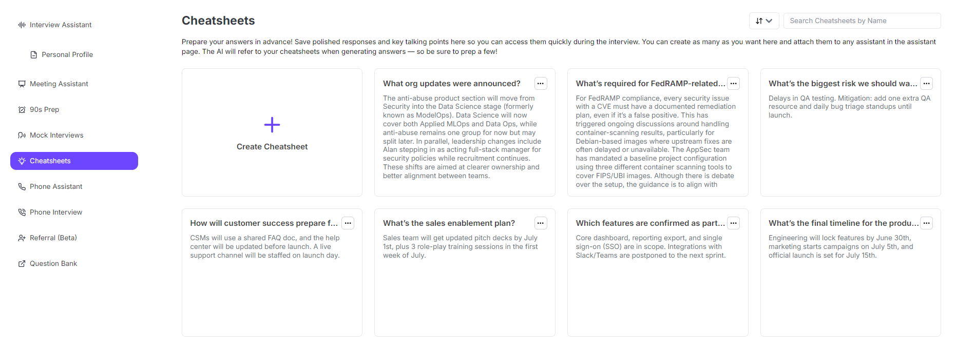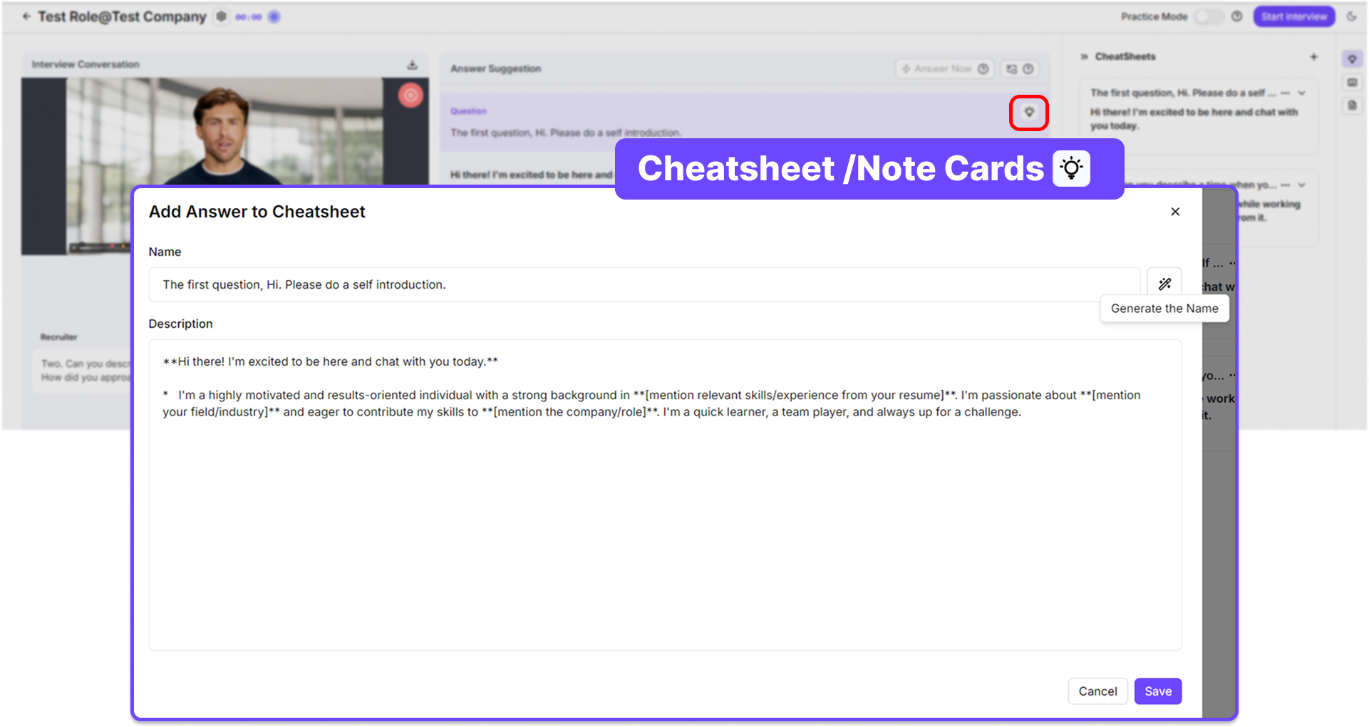 - Interview Example: While practicing “Tell me about yourself,�?the AI suggestion can be instantly saved into a cheatsheet, so it’s ready to pull up in the actual interview.