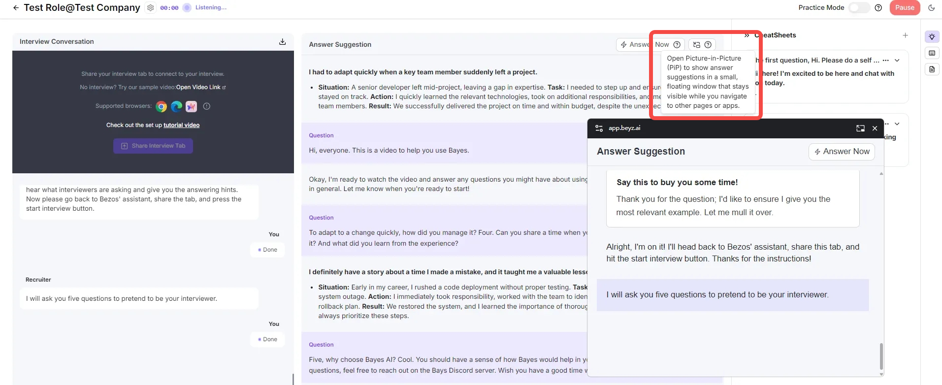 - Interview example: A candidate loaded a cheat sheet with stories from past projects based on the STAR process. When asked, "Tell me about a time when you resolved a conflict," Beyz immediately pulled up the story outline and gave a concise, structured response.