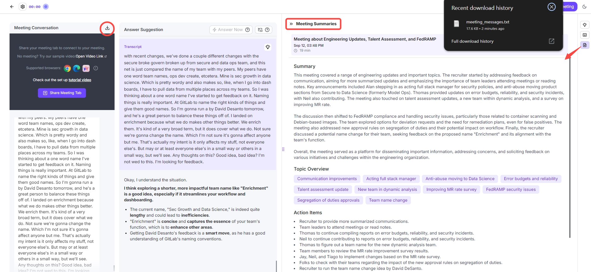 - What it does: Generates meeting summaries and downloadable transcripts automatically.