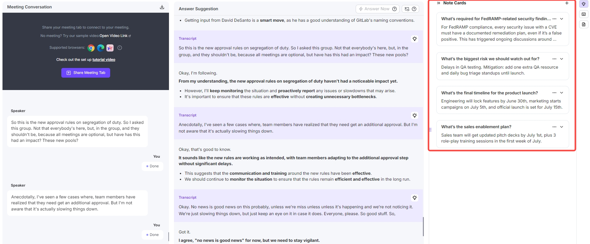 - Meeting Example: In a client Q&A, if the assistant generates a strong security-related response, you can add it as a note card for all future demos with the same objection.