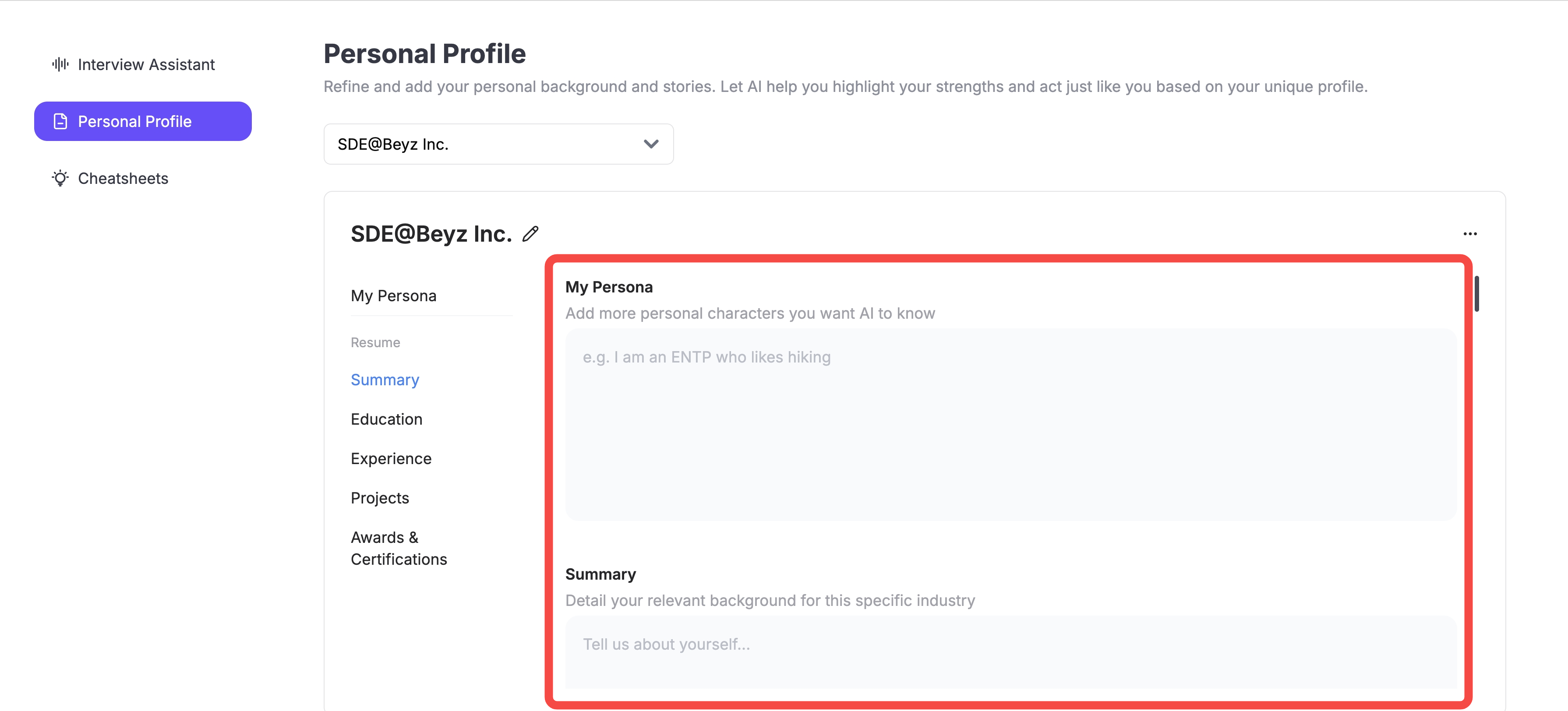 We also provide a practice mode for you (as the interviewer) to ask AI questions that you are interested in and get tailored answers based on your personal profile. This is useful for interview preparation!