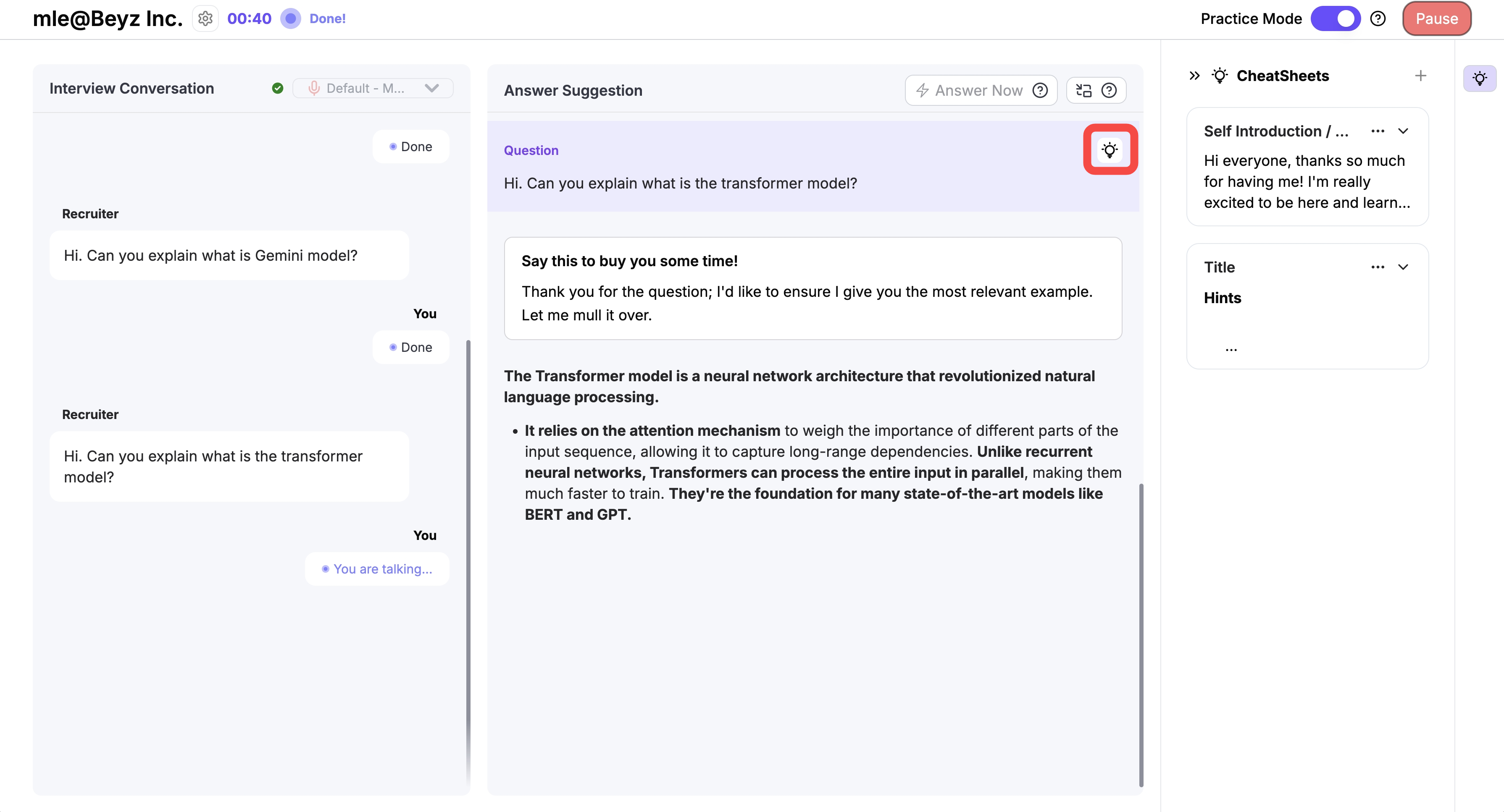Skip the long onboarding docs. Practice Mode is ideal for anyone looking to prep before a meeting or call, especially if you want to rehearse common questions or test your talking points.