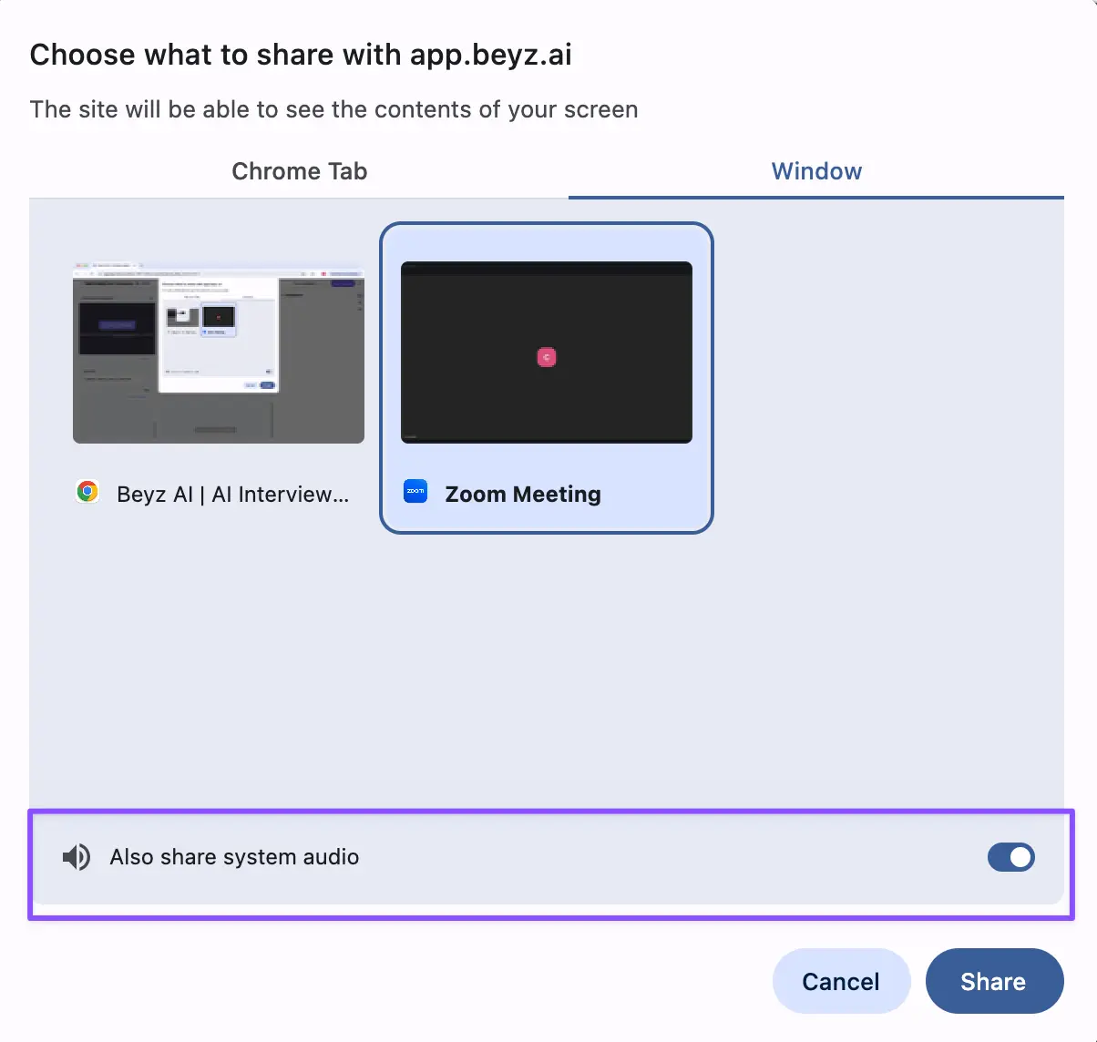 This step is essential before joining your actual interview**.** Beyz won't be able to record audio or offer real-time assistance without it.