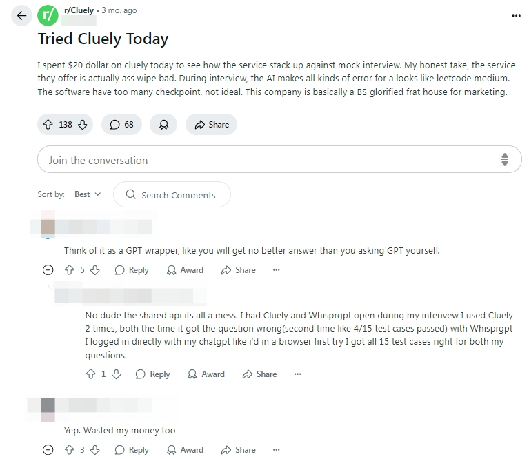 “The lag made real-time responses awkward, even though the summaries were decent.�? “I paid $20 to try Cluely and it was honestly unusable. During an interview it gave wrong answers for basic coding questions,felt like a GPT wrapper with extra checkpoints.�?