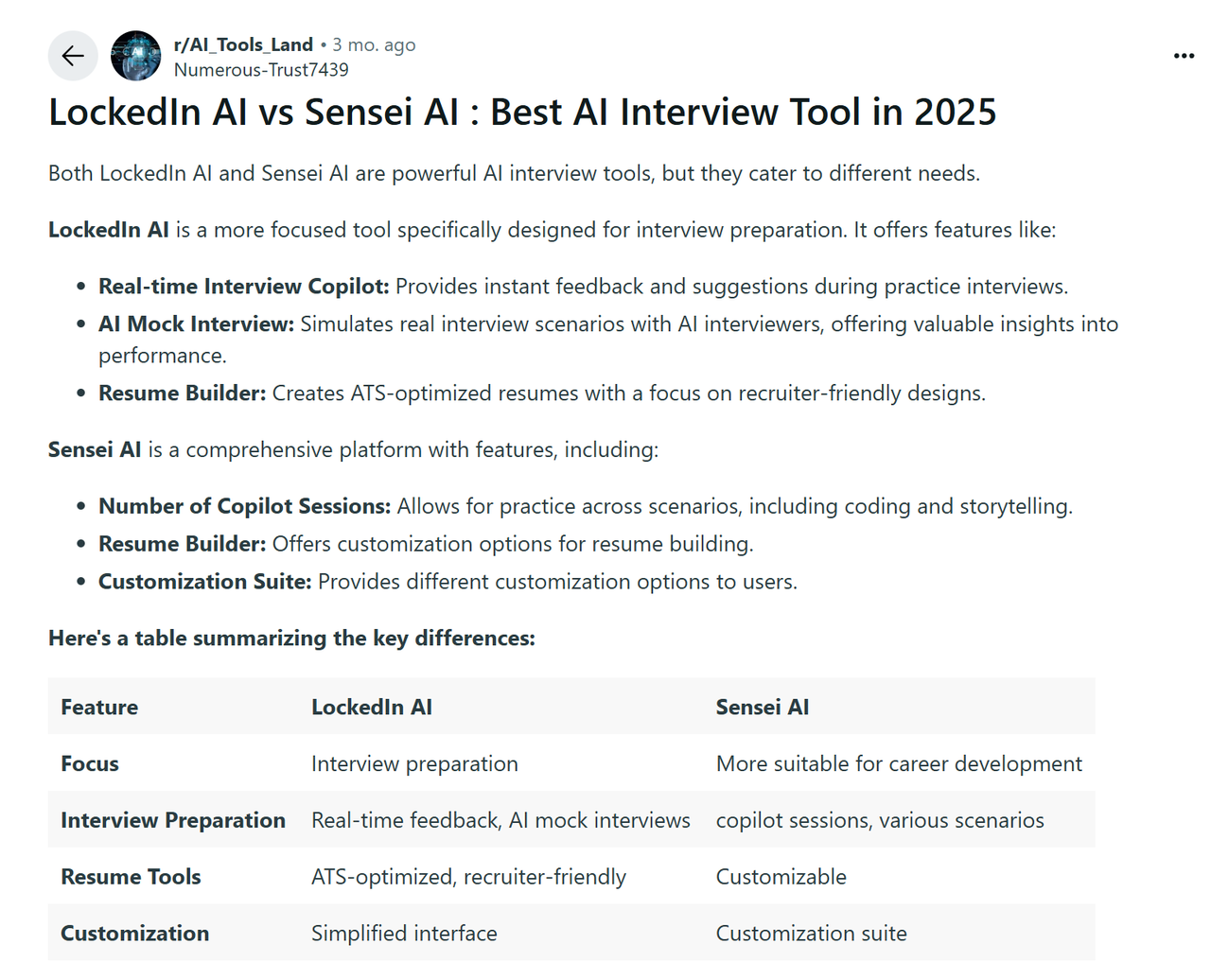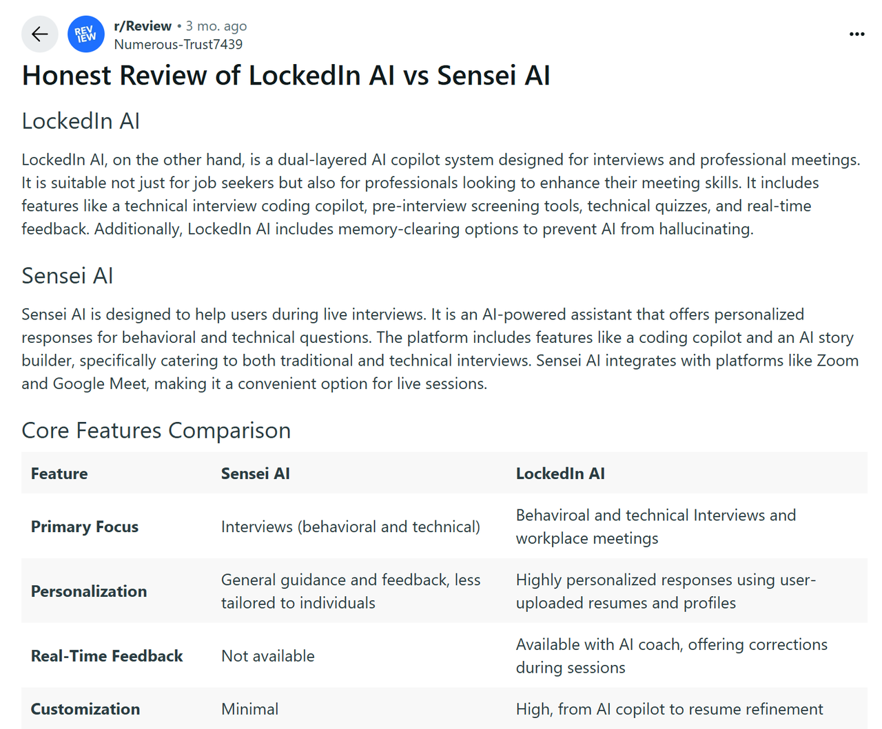 When I searched “AI interview copilot” on Reddit, Sensei AI kept popping up—often alongside names like FinalRound, LockedIn, and Verve. Some users praised its clean interface and flexibility across both technical and behavioral interviews. Others criticized its lack of real-time feedback and minimal personalization compared to alternatives.