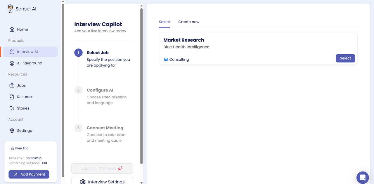 Once your resume and stories are uploaded, you can head over to the AI Playground to practice.