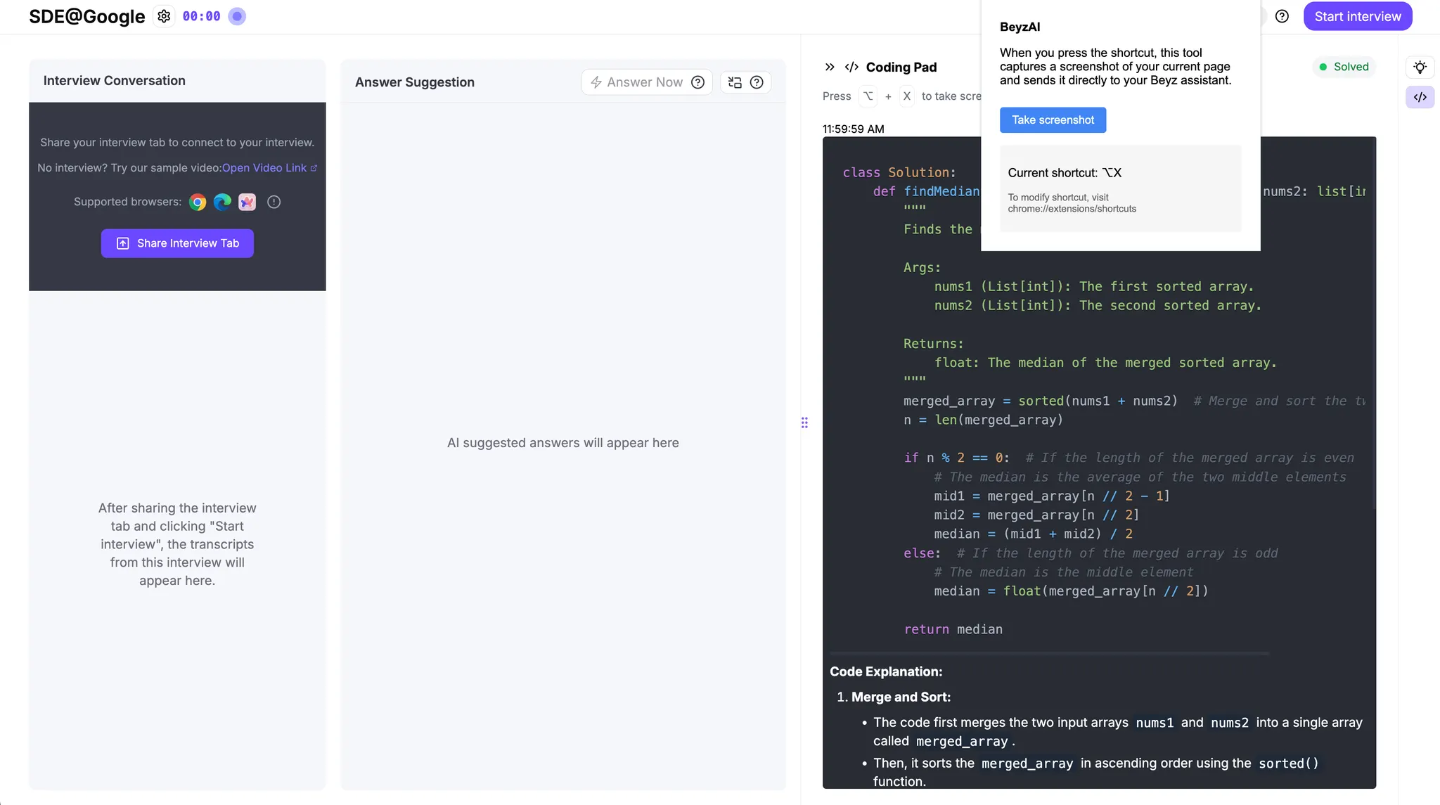 Beyz runs in a minimized, stealth overlay. It doesn’t show on screen share and won’t trigger distracting pop-ups.